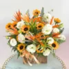 Sắc đỏ nổi bật từ hoa đồng tiền kết hợp với sắc vàng rực rỡ từ hướng dươngkhông những mang đến sự may mắn, thịnh vượng, mà còn gọi mời những điều tốt lành nhất đến với người nhận để họ có thể bắt đầu chuyến hành trình đầy tốt đẹp, thuận lợi và gặt hái được nhiều thành tựu. Chiếc kệ được thiết kế với thông điệp đặc biệt thể hiện niềm vui và mong ước chân thành dành cho những thành công sắp tới và sự khởi đầu mới đầymay mắn của người nhận mà người gửi muốn nhắn nhủ và trao gửi.